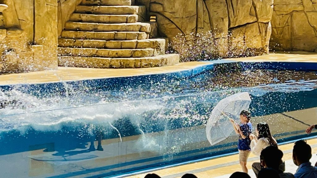 アシカショーは、いろんなところで見たけれど、お客さんを前に呼んでアシカのヒレでバシャバシャ水をかけるタイプは初めてみた!🤣
