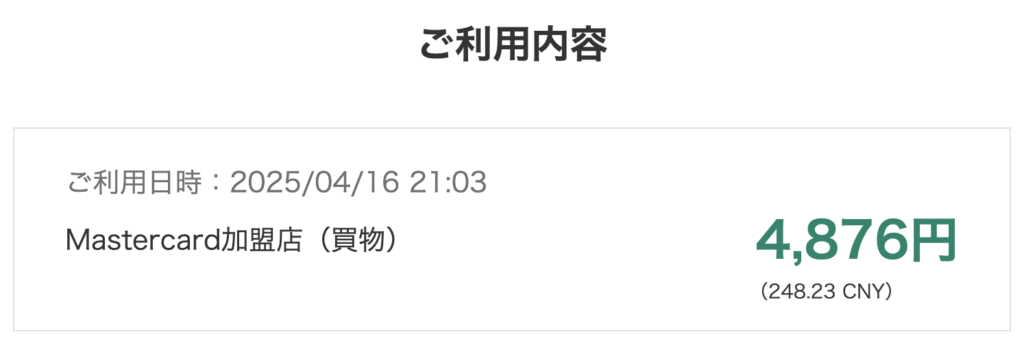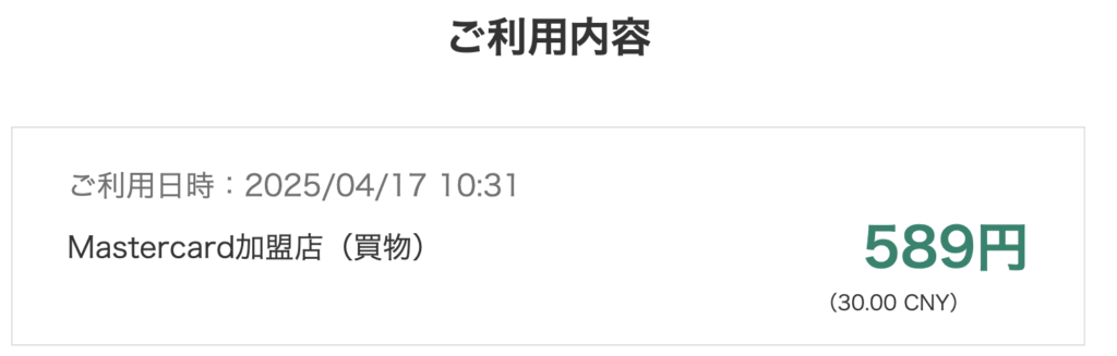 利用金額と人民元価格も記載されているし、