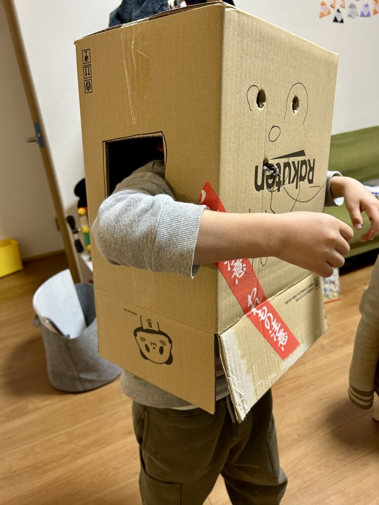 トウタロボ トウタ X Facebook はてブ Pocket LINE コピー 2026.02.05 今までも度々ダンボールは被っていたけれども、いつの間にか穴を開けて顔を描いたのは初めてかな?さすが6歳? 子育てパパランキング ダンボールを再利用? : ぢょんいえーの航海表座椅子の空き箱を重ねておいたら、すっかりトウタの落書き場所になった。まぁ、壁に描かれるより全然良い。ママやトトにも描くように催促してくるのに、描いたらその上に重ねて描くのは何なんだ? 子育てパパランキング